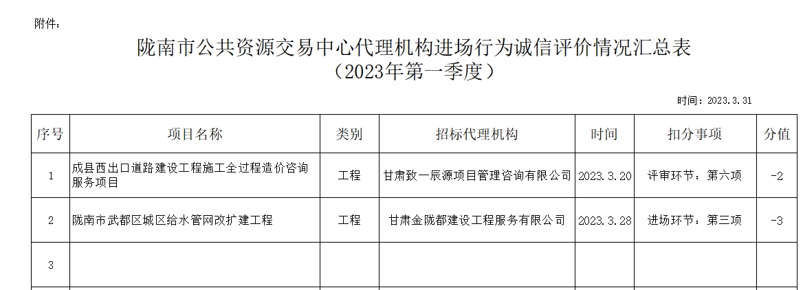 根據(jù)《甘肅省公共資源交易代理機(jī)構(gòu)管理辦法》(甘政辦發(fā)〔2019〕107號(hào))和《隴南市公共資源交易中心代理機(jī)構(gòu)進(jìn)場行為誠信評(píng)價(jià)實(shí)施制度(試行)》規(guī)定,現(xiàn)對(duì)2023年第一季度,共2家代理機(jī)構(gòu)2條進(jìn)場行為誠信評(píng)價(jià)記錄予以通報(bào)(詳見附表)。請各代理機(jī)構(gòu)嚴(yán)格遵守各項(xiàng)規(guī)章制度、誠實(shí)守信,規(guī)范操作,為招標(biāo)人和采購人提供專業(yè)、高效、規(guī)范的招標(biāo)代理服務(wù)。