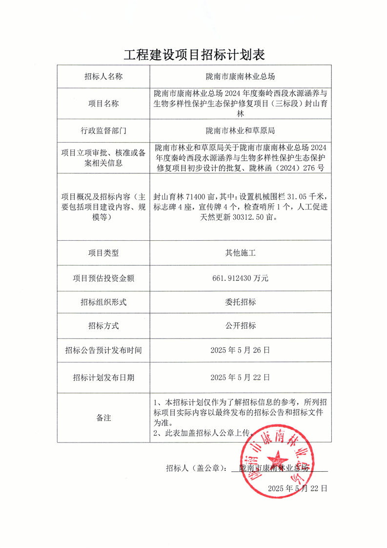隴南市康南林業(yè)總場2024年度秦嶺西段水源涵養(yǎng)與生物多樣性保護(hù)生態(tài)保護(hù)修復(fù)項目(三標(biāo)段)封山育林