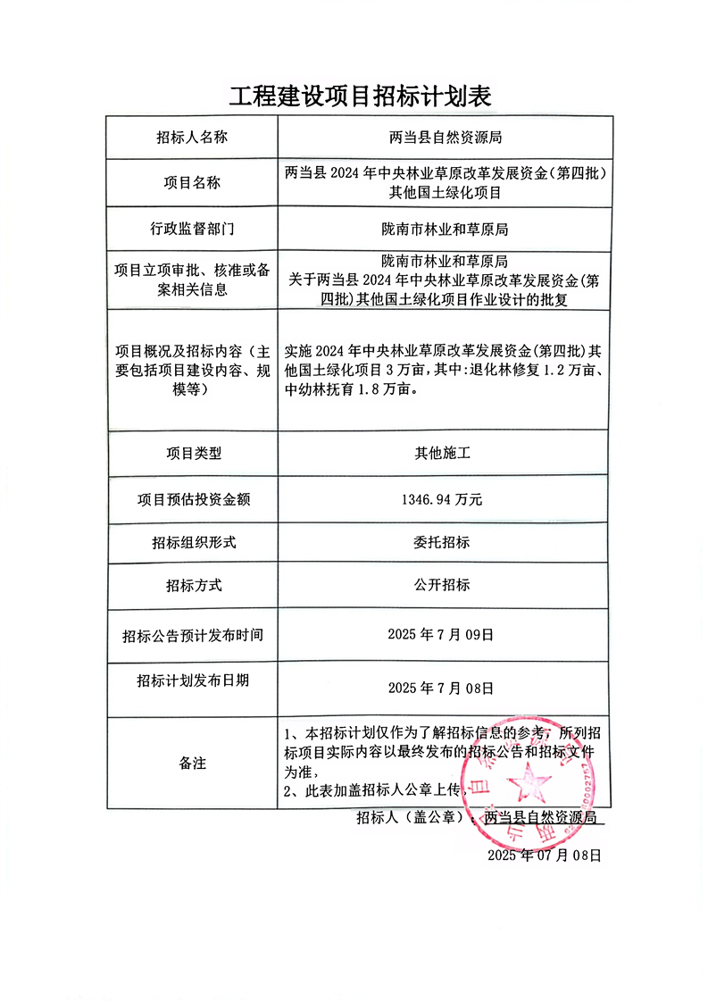 兩當(dāng)縣2024年中央林業(yè)草原改革發(fā)展資金(第四批)其他國土綠化項目