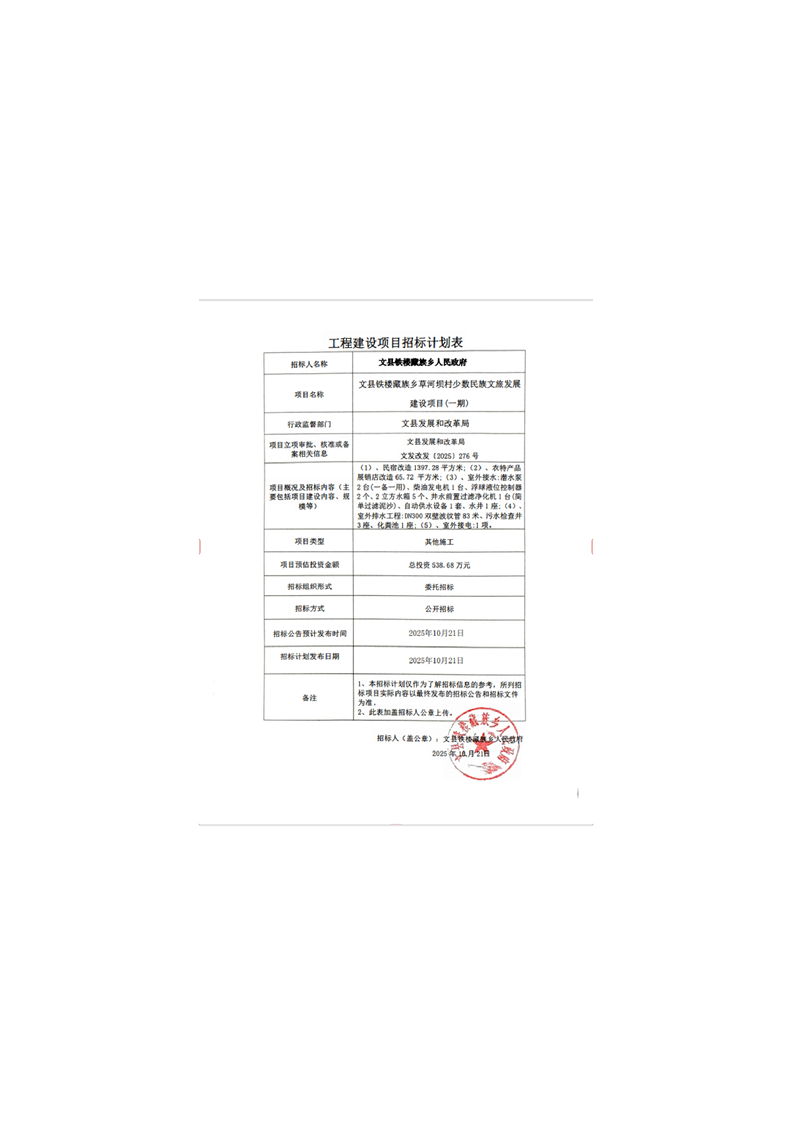 文縣鐵樓藏族鄉(xiāng)草河壩村少數(shù)民族文旅發(fā)展建設(shè)項目(一期)